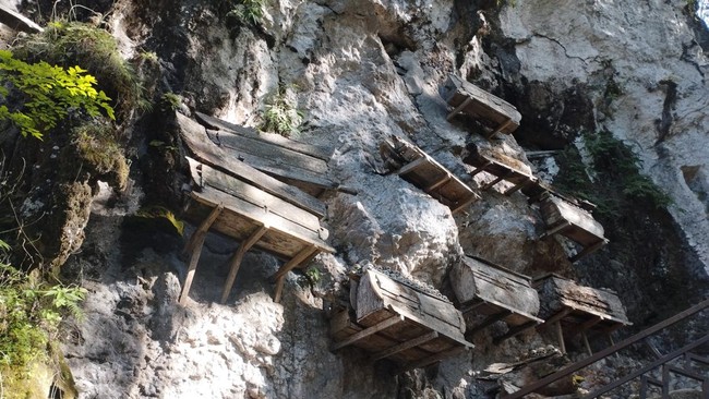 Mereka ingin 'berwisata kematian' dengan melihat kuburan batu dan peti-peti mati yang tergantung di tebing. Konon, pemakaman di tebing batu ini sudah ada sejak abad ke-13.