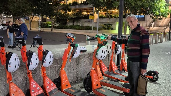 Yang menarik, di Brisbane disediakan juga otopet listrik sebagaimana di foto saya ini. Saya tadinya mau coba, tapi "takut jatuh", maklum lansia 70 tahun. Di tengah kota juga disediakan bis gratis, baik yang "City Loop" maupun yang "Spring Hill Loop".
