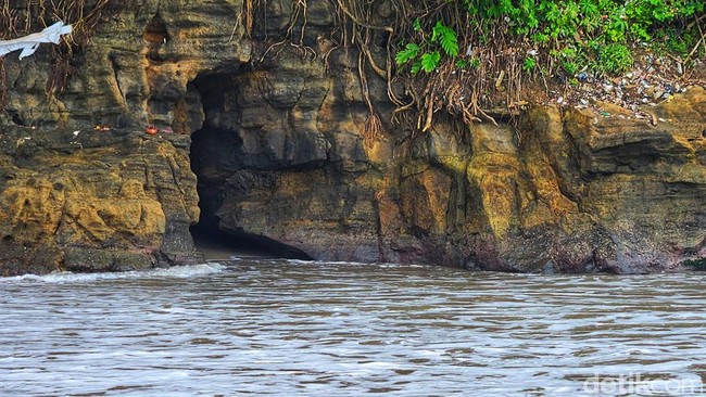 Gua itu dikenal sebagai Gua Keramat Karang Hawu, berada di balik batu besar di kaki tebing yang disebut Gunung Winarum. Lokasinya hanya bisa dicapai dengan menaiki jalan setapak dari sisi timur pantai.