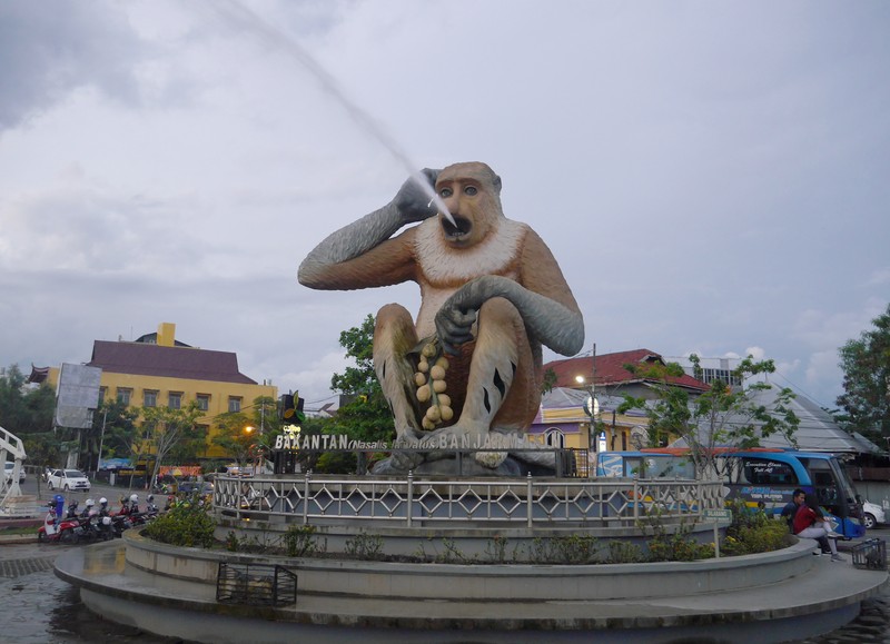 Foto: Patung bekantan ini dibuat setinggai 6 meter dan di bagian bawahnya bertuliskan 'BAKANTAN (Nasalis larvatus) BANJARMASIN'. Air mancur pun tampak menyembur dari mulutnya (Kurnia/detikTravel)