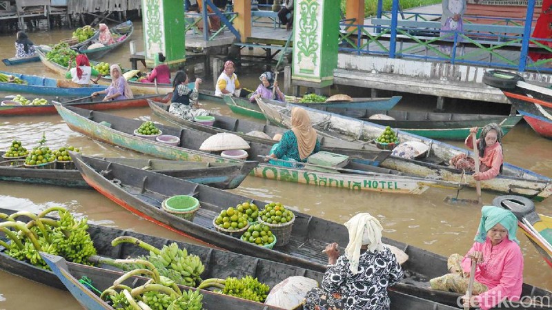 Ada beberapa pasar terapung Banjarmasin. Salah satu yang legendaris dan populer adalah pasar terapung Lok Baintan di Sungai Martapura (Kurnia/detikTravel)
