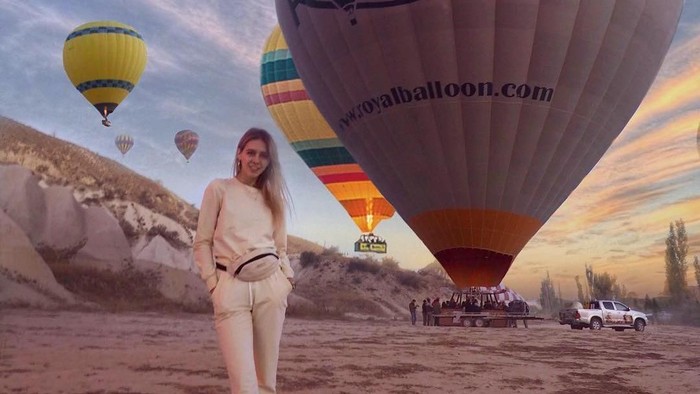 Di awal Desember ini, Angela baru saja liburan ke Turki. Hal itu pun diketahui saat ia memposting fotonya di depan balon udara di Cappadocia (@angela_nikolau/Instagram)