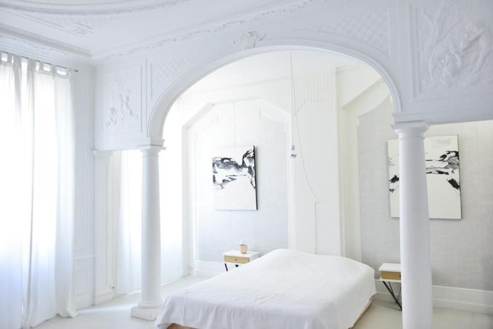 Di L'Appartement, Marseille, Prancis ada sebuah kamar serba putih dengan pilar-pilar berwarna senada. Di pilar ini pasangan bisa bersandar saat bercinta (dok. booking.com)