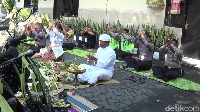 Denpasar - Bali selalu punya cara untuk menarik wisatawan, sebut saja Upacara Tumpek Landep. Ritual ini berupa ucapan syukur untuk senjata, termasuk milik kepolisian.