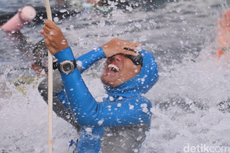 Ketika naik ke permukaan, para freediver ini memperlihatkan kartu putih ke juri seperti yang dilakukan atlet asal Indonesia, Nikita Fima Atriyu ini. Setelah dinyatakan menang, selebrasi pun dilakukan (Agus Setyadi/detikTravel)