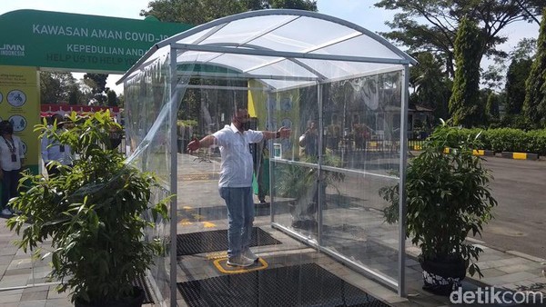 Setelah cuci tangan, pengunjung lanjut memasuki bilik desinfektan untuk pencegahan virus.