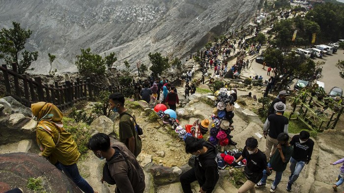 Jawa Barat - Gunung Tangkuban Parahu menjadi destinasi untuk menikmati alam selama libur lebaran 2021. Seperti terlihat hari ini, objek wisata itu ramai oleh pengunjung.