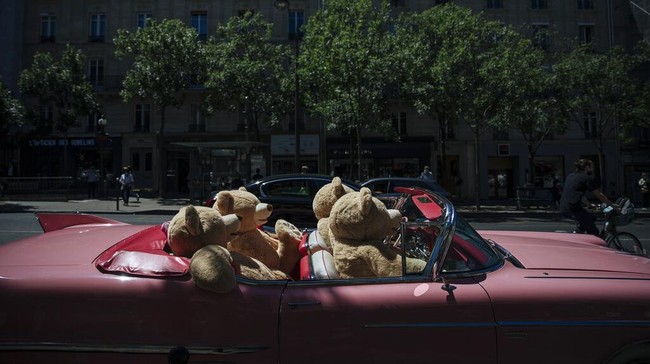 Paris - Sejumlah boneka beruang berukuran besar menarik perhatian warga Paris. Boneka-boneka itu berkeliling Kota Paris dengan menggunakan mobil tua. Ini penampakannya.