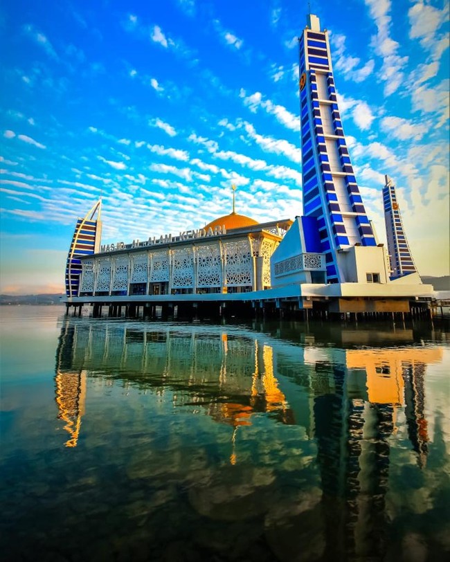 Kendari - Inilah Masjid Al-Alam di Kendari. Saat senja, masjid ini terlihat terapung di tengah lautan.