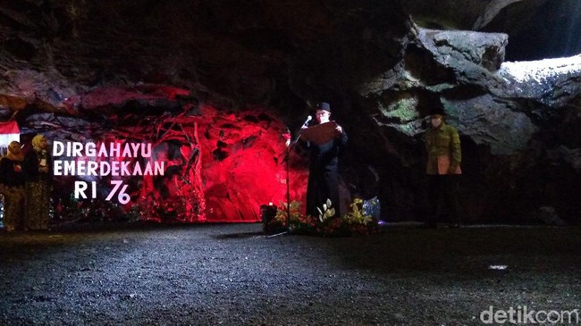 Upacara bendera memperingati HUT ke-76 RI digelar berbeda pada salah satu obyek wisata di Purbalingga, Jawa Tengah. Upacara tidak digelar di lapangan atau tempat terbuka, melainkan di dalam gua. (Vandi Romadhon/detikTravel)