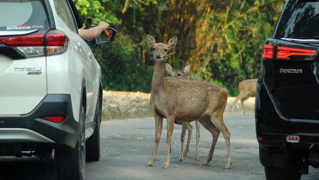 Wisatawan memberi makan wortel untuk rusa saat wisata satwa di Taman Safari Indonesia (TSI), Cisarua, Kabupaten Bogor, Jawa Barat, Minggu (29/8/2021).