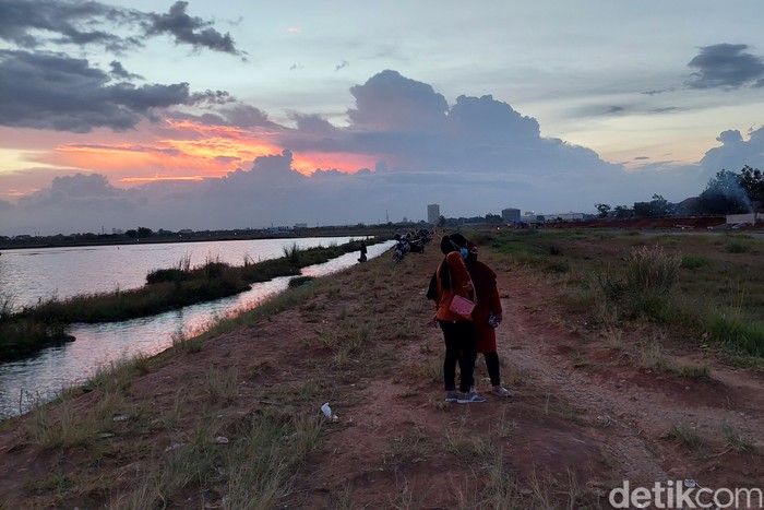 Lembayung senja warna langit Bandung. Lembayung berwarna merah ini hiasi Masjid Apung Al-Jabar, Kota Bandung.Β (Wisma Putera/detikcom)