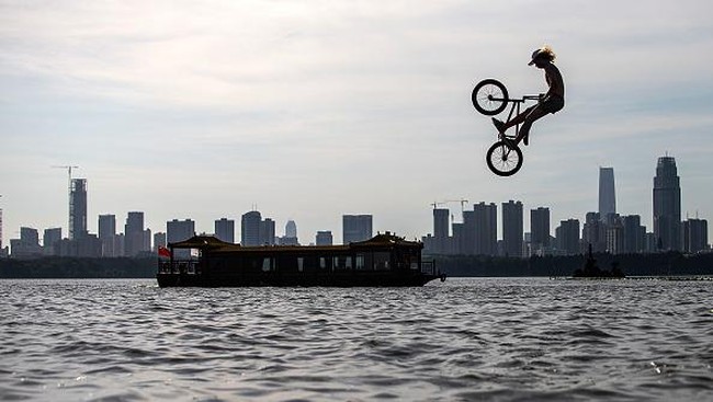 Wuhan - Sejumlah warga unjuk kebolehan melompati danau menaiki sepeda hingga skuter di festival lompat air yang digelar di Wuhan. Seperti apa aksinya? Lihat yuk.
