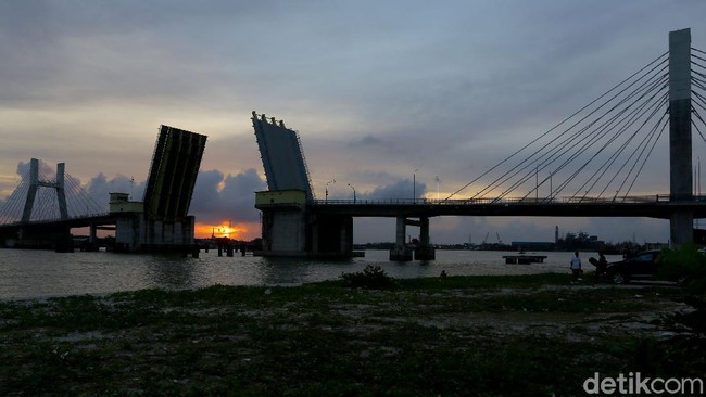 Pangkal Pinang - Jembatan Emas menjadi salah satu ikon dari Kota Bangka Belitung. Jembatan yang menghubungkan Kabupaten Bangka dan Kota Pangkalpinang itu bisa dibuka tutup.