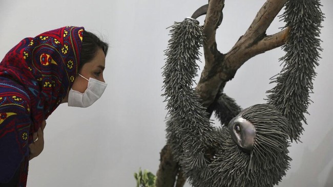 Seorang pengunjung melihat patung hewan yang dibuat dari logam di kawasan Kebun Binatang Logam Shahreza, Iran.