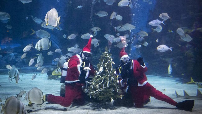 Hungaria - Penyelam berpakaian sinterklas mendekorasi pohon natal di bawah air. Aksinya ini dikelilingi beragam ikan termasuk hiu. Yuk lihat potretnya.