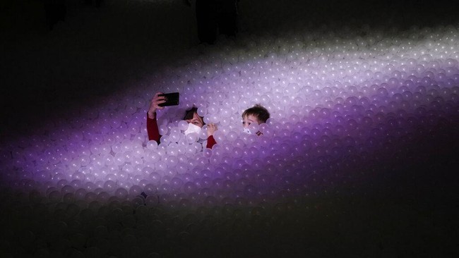Orang-orang berenang di kolam bola dalam pameran seni 'Let's Fly' di Museum Balon Roma, yang seluruhnya terdiri dari balon dan karya seni tiup, Rabu (5/1/2022).