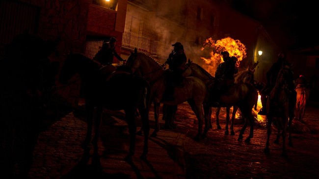 Sekitar 100 kuda beratraksi melompati api unggun dalam festival Las Luminarias, Spanyol pada Minggu (16/1/2022).