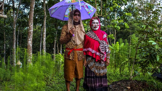 Sore selepas hujan rintik-rintik di kawasan hutan pinggiran Kota Tasikmalaya, terlihat dua pria berdandan dihiasi gincu tebal bersiap untuk melakukan atraksi ketangkasan akrobatik khas dari tanah Sunda, kegiatan ini diperankan dua orang pria berpakaian menyerupai perempuan.
