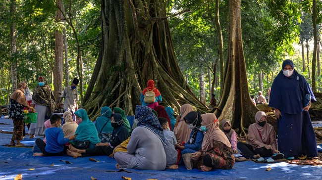 Warga berkumpul untuk berziarah dalam tradisi Nyadran di kompleks pemakaman Sentono, Kelurahan Ngijo, Gunungpati, Semarang, Jawa Tengah, Kamis (17/2/2021).