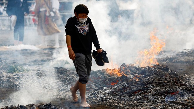 Tokyo - Festival berjalan di atas api yang juga disebut Himawari Matsuri kembali digelar di Jepang. Dalam festival itu warga berjalan tanpa alas kaki di atas bara api.