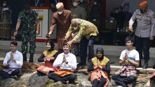 Sekretaris Daerah Provinsi Lampung Fahrizal Darminto (kedua kiri) menyiram kepala muda-mudi saat acara Belangiran di Bandar Lampung, Lampung, Kamis (24/3/2022). (ANTARA FOTO/Ardiansyah)