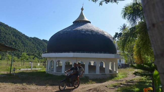 Pengendara sepeda motor melintas di dekat situs Kubah Masjid Tsunami, Desa Gurah, Kecamatan Peukan Bada, Kabupaten Aceh Besar, Aceh, Selasa (12/4/2022).