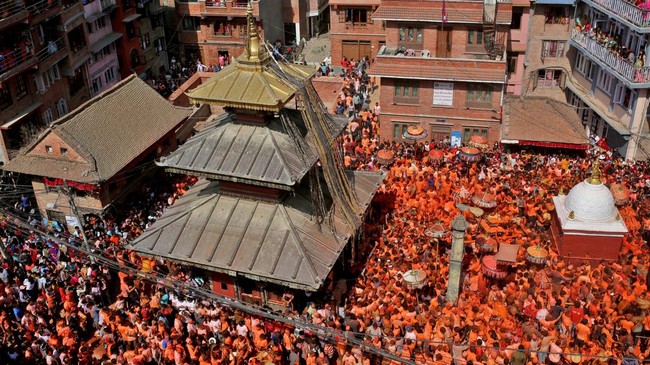 Thimi - Nepal mendadak berwarna oranye, khususnya di kawasan Thimi. Warna itu muncul saat warga menggelar Festival Sindoor Jatra.
