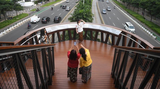 Warga berfoto di Jembatan Penyeberangan Orang (JPO) Pinisi di Jalan Jenderal Sudirman, Jakarta, Sabtu (9/4/2022).