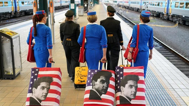 Penggemar Elvis Presley berkumpul di Stasiun Kereta Api Pusat Sydney sebelum berangkat ke Festival Parkes Elvis, saat acara kembali digelar setelah pandemi penyakit virus corona (COVID-19), di Sydney, Australia, (21/4/2022). REUTERS/Loren Elliott