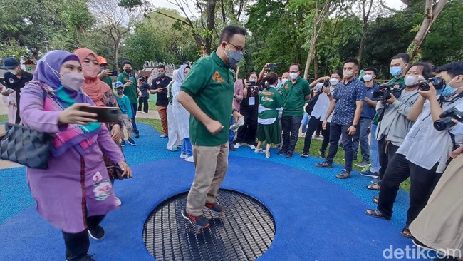 Gubernur Anies Baswedan mencoba trampolin di Tebet Eco Park di sela-sela peresmian taman di Jaksel itu pada Sabtu (23/4). (Wildan-detikcom)
