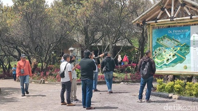 Garut - Taman Wisata Alam (TWA) Gunung Papandayan diserbu wisatawan di momen libur Lebaran 2022. Wisatawan yang datang didominasi para pendaki.