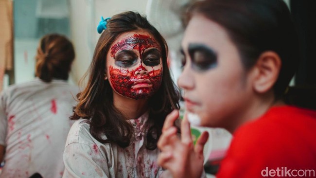 Sejumlah talent tengah merias diri dengan makeup karakter hantu di CBD Ciledug, Kota Tangerang, Selasa (10/5/2022).