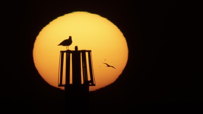 Seekor burung camar tampak berada di dalam matahari terbit di kawasan Dover, Inggris. (Dan Kitwood/Getty Images).