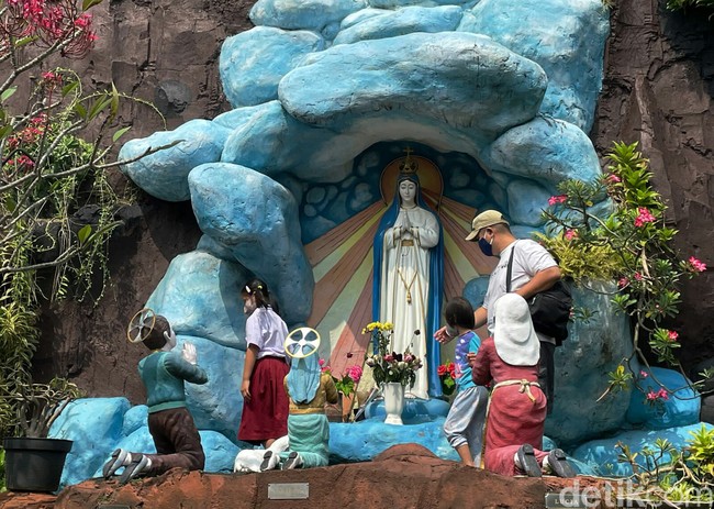 Gereja ini bernama Santa Maria de Fatima. Nama ini didasarkan pada kisah Bunda Maria yang pernah menampakkan kehadirannya di depan tiga orang anak bernama Lucia, Yasinta, dan Francis di Kota Fatima, Portugal. Peristiwa ini digambarkan di area depan gereja melalui keberadaan patung-patung yang merekonstruksi kisah tersebut. (Rengga Sancaya/detikcom)