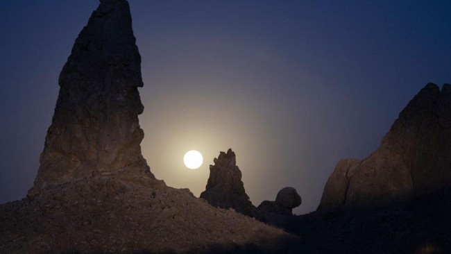 California - Bulan purnama stroberi di langit California berpadu dengan lansekap area konservasi Trona Pinnacles. Perpaduan apik, menghasilkan keindahan foto memukau.