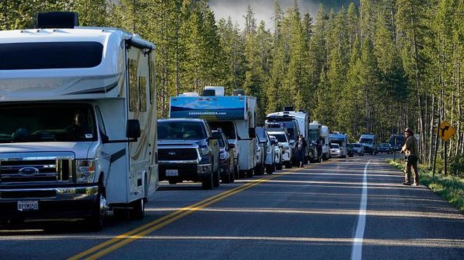 Deretan mobil antre untuk masuk ke Taman Nasional Yellowstone di Wyoming, Amerika Serikat, Rabu (22/6/2022) waktu setempat.