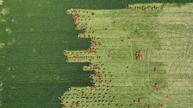 China - Aktivitas sejumlah petani bayam di kawasan Bozhou, China, terlihat bak lukisan saat difoto menggunakan drone. Yuk, intip foto-fotonya.