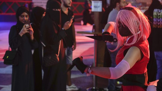 Jeddah - Kawasan Jeddah, Arab Saudi, ramai oleh pengunjung yang mengenakan kostum karakter anime Jepang. Tak sedikit di antaranya yang mencuri perhatian pengunjung lain.