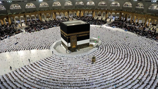 Mekah - Umat Muslim berdoa di sekitar Ka'bah di Masjidil Haram di kota suci Mekah, Arab Saudi. Mereka bisa kembali berhaji usai sempat tertunda karena COVID-19.