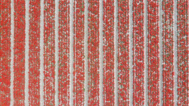 Ini dia salah satu lansekap foto drone yang memperlihatkan ladang bunga tulip berwarna merah, saat dijepret musim semi 2022 lalu.