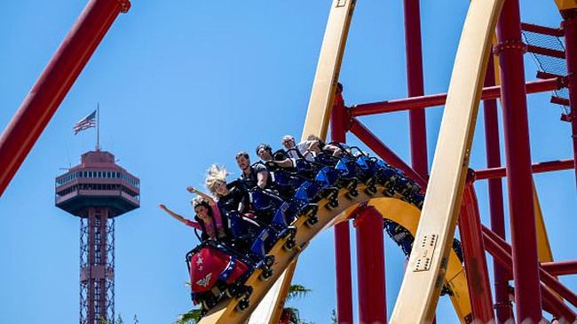 Orang-orang menaiki roller coaster Wonder Woman Flight of Courage yang baru diresmikan di Six Flags Magic Mountain, Valencia, California, Amerika Serikat, Kamis (14/7/2022).