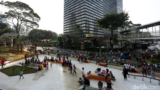 Taman Dukuh Atas, taman ini menjadi tempat ngumpulnya anak skate nih, karena ada arena skateboardnya. Pengunjung bisa main skateboard atau sekadar duduk santai menunggu senja. (Rengga Sancaya/detikcom)