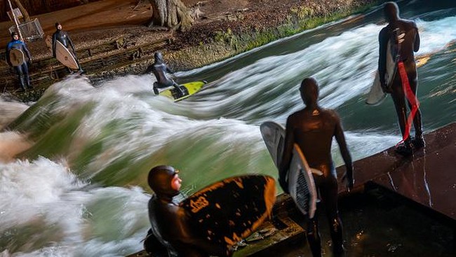 Jerman - Biasanya surfing di laut lepas dengan ombak tinggi. Namun di Eisbach, Jerman, surfing dilakukan di sungai. Sebab, sungai buatan itu memiliki arus yang deras.