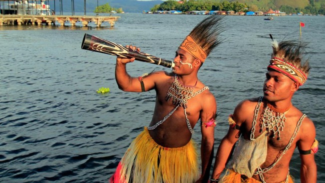 Dalam acara pembukaan Pagelaran Budaya Nusantara, Penari dari Kampung Ayapo meniup terompet tradisional ame di Pantai Khalkote, Distrik Sentani Timur, Kabupaten Jayapura, Papua, Kamis (28/7/2022).