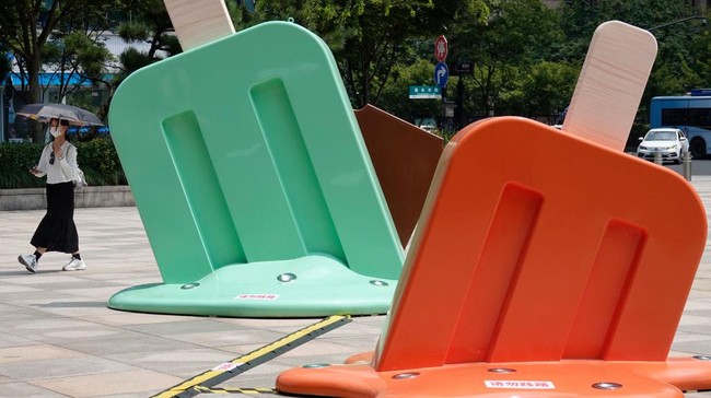 Hangzhou - Gelombang panas yang menerjang kawasan Hangzhou, China, membuat sejumlah es krim raksasa mencair. Ini foto-fotonya!
