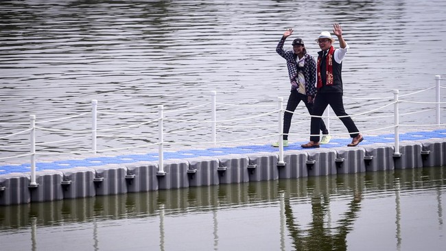 Ridwan Kamil berjalan bersama Bonge di atas floating brigde Situ Rawa Kalong, Curug, Depok, Jawa Barat, Jumat (5/8/2022).