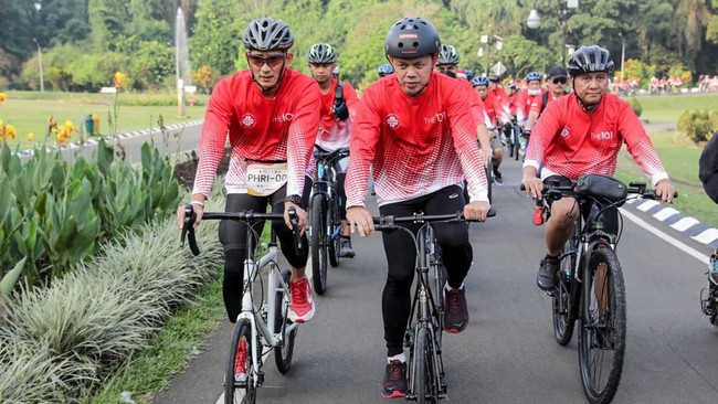 Bogor - Menparekraf Sandiaga Salahuddin Uno mengikuti PHRI BikeTour di Kota Bogor. Dia gowes bareng Wali Kota Bogor Bima Arya.