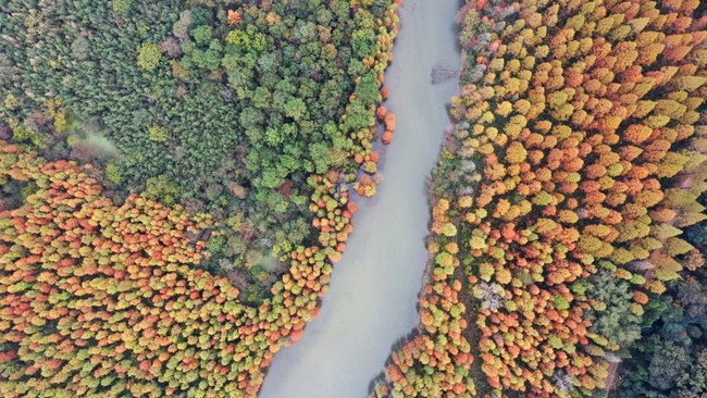 Lanskap pertama ada suasana musim gugur di Taman Hutan Nasional Taizishan, Jingmen, China. Jejeran pohon metasquoia berwarna kuning-oranye terlihat sangat mempesona. Foto ini diambil pada 20 November 2020.