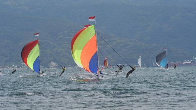 Sulawesi Tengah - Lomba balap perahu layar tradisional digelar melintasi Teluk Palu. Lomba ini untuk memperingati HUT ke-77 RI sekaligus melestarikan perahu layar tradisional.